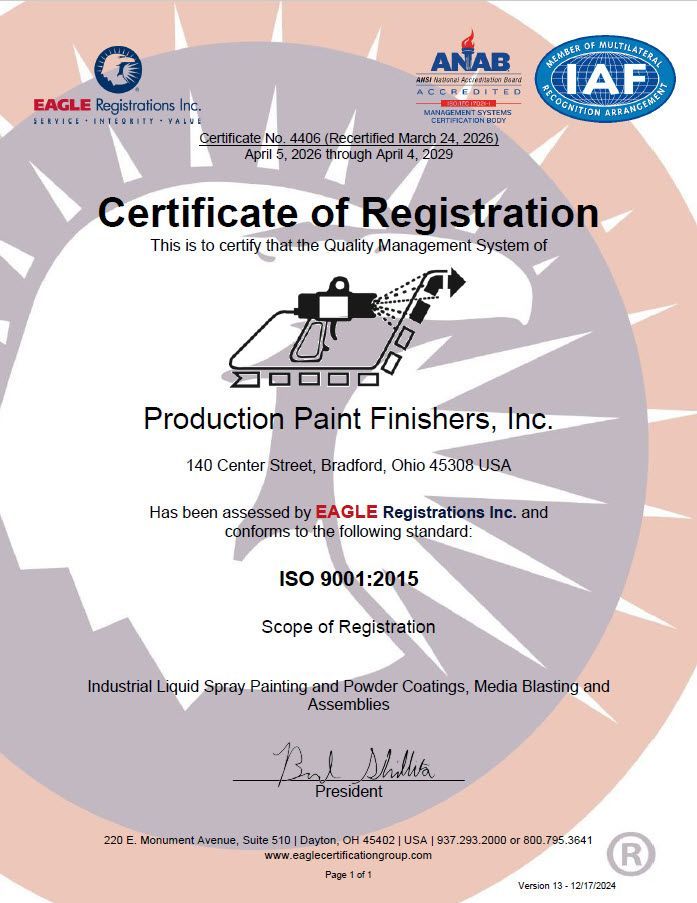 PPF, Inc. is certified for all powder coating, liquid coating, sandblasting, military (CARC) and commercial projects. Our ISO 9001:2015 certification demonstrates our ability to consistently provide liquid coating, powder coating, military (CARC), sandblasting services and more in a manner that consistently meets our customer and applicable statutory and regulatory requirements. Furthermore, Production Paint Finishers aims to enhance customer satisfaction through the effective application of the system, including processes for continual improvement of the system, and the assurance of conformity to customer and applicable statutory and regulatory requirements.