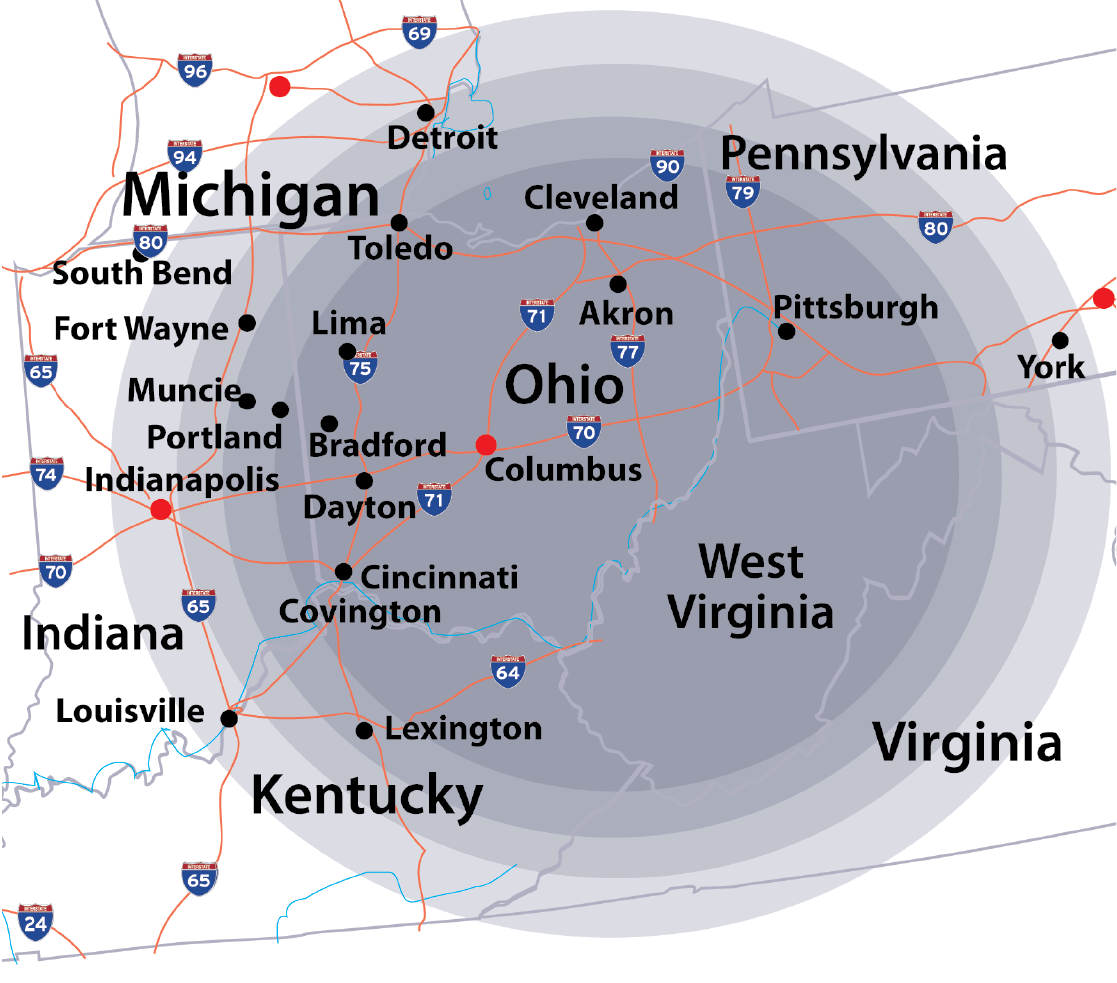 As you can see on the map below, Production Paint Finishers serves a huge portion of the Midwest, spanning Ohio, Michigan, Kentucky, Pennsylvania, West Virginia, and Virginia. This strategic location positions PPF's reach into America's Midwestern markets. We are within one day's drive of more than 50% of the United States and Canadian population and 70% of all North American manufacturing locations.